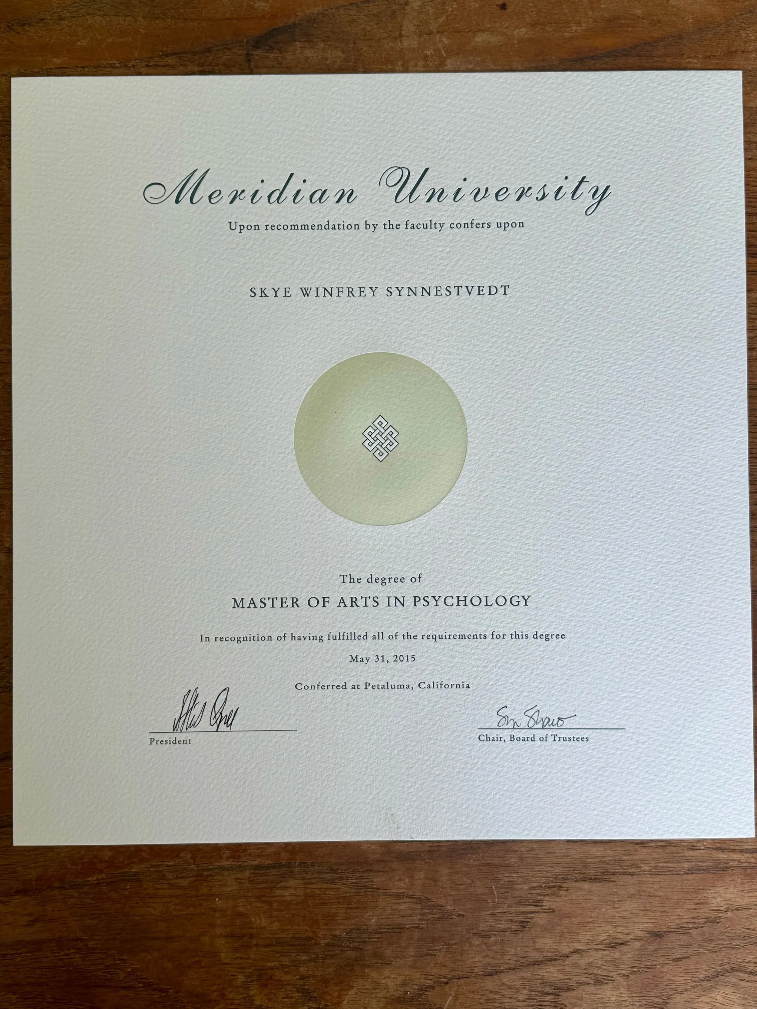 Graduate degree providing comprehensive understanding of human psychology, mental health theory, and therapeutic approaches. Meridian University's innovative program integrates traditional psychology with holistic and transpersonal approaches, creating a foundation for depth-oriented, transformational healing work that addresses the whole person.