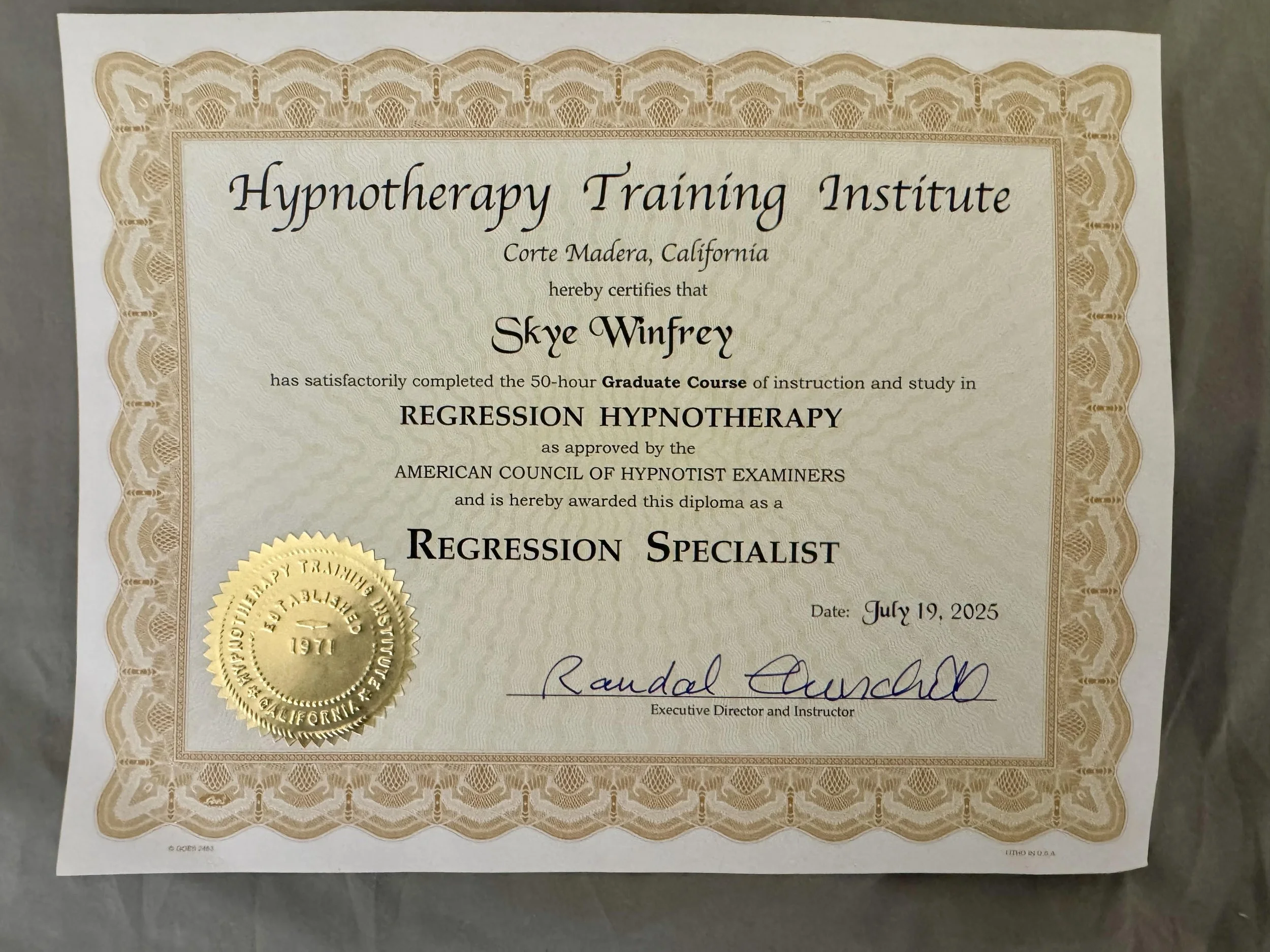 Certified Regression Specialist, Hypnotherapy Training Institute